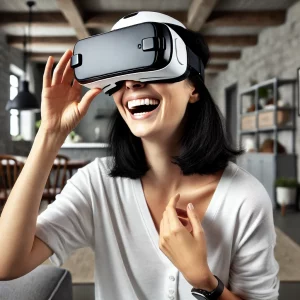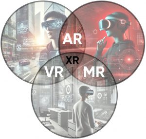 Virtual Reality (VR): In VR werden Nutzerinnen und Nutzer komplett in eine computergenerierte 3D-Umgebung versetzt. Die reale Welt wird dabei vollständig ausgeblendet, und alle Sinneseindrücke (visuell, auditiv und teilweise haptisch) stammen aus der virtuellen Umgebung. So entsteht das Gefühl, vollständig in eine andere Realität eingetaucht zu sein.
